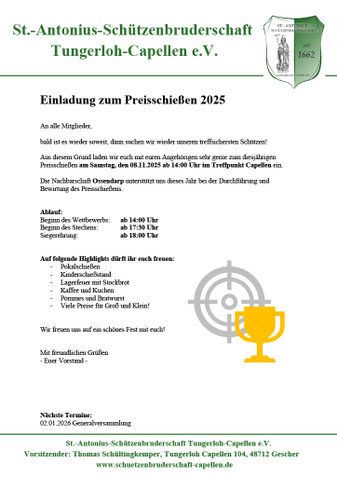 Herzlich Willkommen auf der neugestalteten Internetseite der St.- Antonius Schützenbruderschaft. Auf diesen Seiten findet ihr aktuelle Informationen rund um das Vereinsleben, unsere Veranstaltungen und alles Wissenswerte.